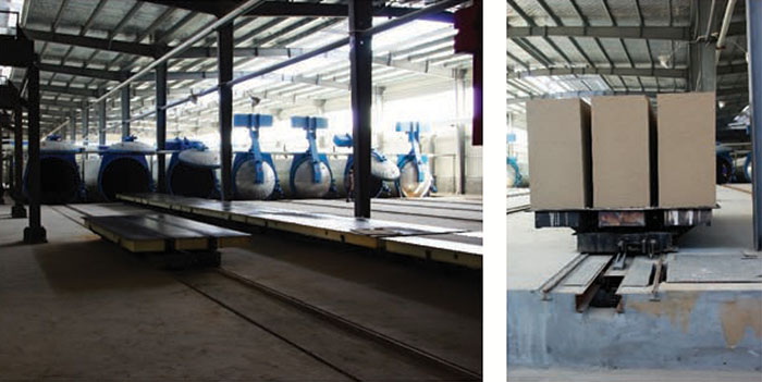蒸養(yǎng)小車是生產(chǎn)過程中的專用運(yùn)輸車輛,其裝載著切割后的坯體,進(jìn)入蒸壓釜蒸養(yǎng)。蒸養(yǎng)后,將成品運(yùn)送至成品場(chǎng)地。成品雕吊卸后,蒸養(yǎng)車再次載坯體入釜蒸養(yǎng)。