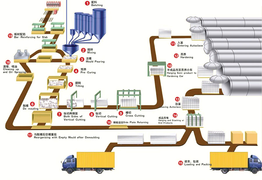 首先將儲(chǔ)存的原材料計(jì)算配料(1)后進(jìn)入澆筑攪拌機(jī)內(nèi),經(jīng)攪拌(2)均勻后澆注(3)在模具內(nèi), (板材配筋(19) ),經(jīng)過(guò)一定溫度個(gè)時(shí)間的預(yù)養(yǎng)(4) 坯體達(dá)到一定厚度后,由翻轉(zhuǎn)吊具下列功能: A把模具在空中做90度翻轉(zhuǎn) (5)模具的一側(cè)板成為支撐坯體的底板直至蒸養(yǎng)出成品,B吊至小車(chē)或切割支撐架_上完成開(kāi)模、 脫模(6) C脫^下的??蚝头祷氐恼麴B(yǎng)側(cè)板(16)再重新組合成模具 (17)等待清理后噴油(18) 重新澆注。坯體在切割機(jī).上分布做六面切割:A首行坯體兩側(cè)面垂直切割 (7) B然后進(jìn)行縱向水平式切割(8) ,C后進(jìn)行橫向垂直鍘刀式切割(9)。切割好的坯體由半成品吊具連同底板吊至蒸養(yǎng)小車(chē)(10) 然后編組入蒸壓釜(11) 進(jìn)行高溫蒸養(yǎng)(12) 蒸養(yǎng)出釜(13),由成品吊具將成品堆垛(14) 或裝車(chē)、 打包(15),蒸養(yǎng)側(cè)板則返回 (16)